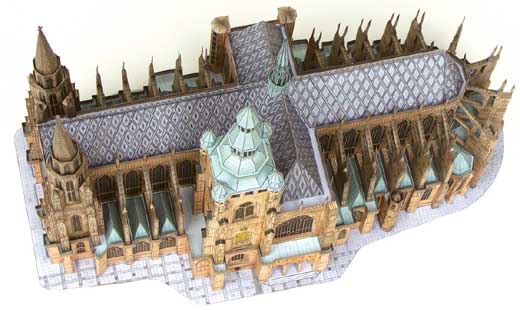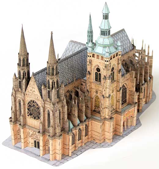 Abychom se nemotali na jednom místě, zmíním poslední novinku na trhu s papírovými modely. Firma Betexa vydala model chrámu sv. Víta na Pražském hradě. Model v M 1:350 o rozsahu 13,3 listu byl v bílém technologickém provedení k vidění již na Model-Hobby a je v prodeji za 150,- Kč. Přestože obsahuje řadu momentů, na které stavitel modelů staveb z ABC není zvyklý, výsledek vypadá zajímavě.