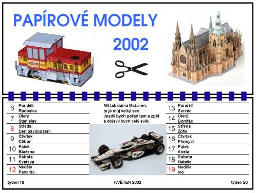 Každým rokem si kupuji stolní kalendář se železničními motivy. Bohužel však letos byl vydán jen jeden a mne se nechtělo koukat doma i v zaměstnání na ten samý. Děti toho využily a k svátku jsem od nich dostal jeden zcela speciální - kalendář modelářský. Syn (8 let) zpracovával obrázky, dcera (11 let) složila k obrázkům básničky. Přestože vznikly za pouhá tři odpoledne, domnívám se, že se jí povedly a proto nabízím i Vám možnost si je v básničkotéce nastudovat.