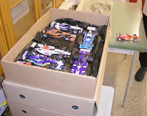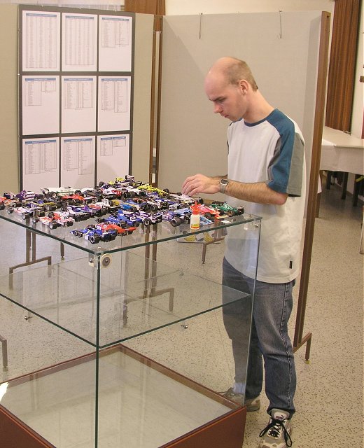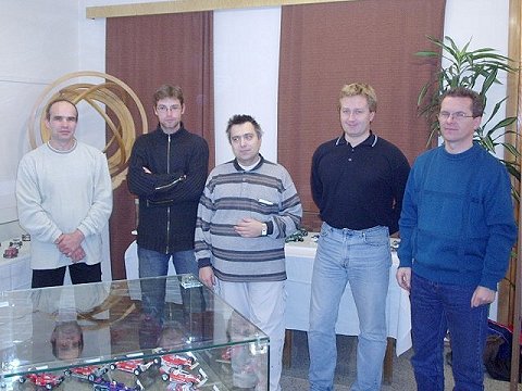(Přitáhl jsem si také pár exemplářů Knihy MPR, které jsem chtěl nechat podepsat pro své přátele, kteří nebyli zahrnuti do hurá akce dne 2004-11-05. Tehdy jsem zrovínka zakoupil prvních 20 kusů MPR (původně jsem pro ně chtěl vyrazit se svým báglem, naštěstí jsem si to včas rozmyslel...), abych tři z nich vzal sebou při své cestě do Hradce Králové. Tam byla naplánována instalace výstavy modelů F1 a dvě z knih byly určeny právě pro organizátory výstavy modelů F1 P. Baldu a M. Drábka. Oba jsou velkými fandy papírových modelů obecně, kousků z dílny pana architekta obzvláště, proto jsem se rozhodl zajistit jim nejen autorův autogram ale rovnou věnování. Přepadl jsem tedy arch. Vyškovského a jsem rád, že chlapci byli nejen překvapeni ale i potěšeni. Dobře jim tak.