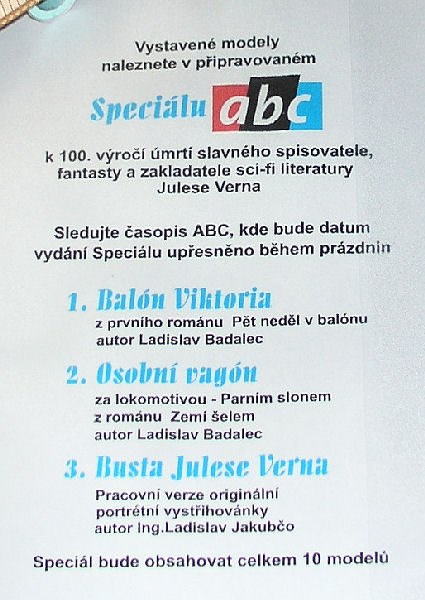 Důvod, proč se o těchto modelech rozepisuji je ten, že ABC chystá další speciál zvaný Století vystřihovánek (doopravdy netuším, kdo ten název vymyslel...), tentokráte s tématikou vynálezů Julese Verna. Na akci Model Show Česká Lípa byl tento záměr představen současně s některými modely, jež bude speciál obsahovat. Můžete se tedy těšit na Balón Viktoria z románu Pět neděl v balónu, Osobní vagón patřící k již zmíněnému Parnímu slonu - z románu Zemí šelem či bustu Julese Verna (na obrázku pracovní verze modelu autora L. Jakubča). Modely vystavené v České Lípě jsou k vidění též na Výstavě papírových modelů v Muzeu Policie.