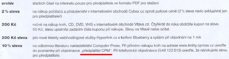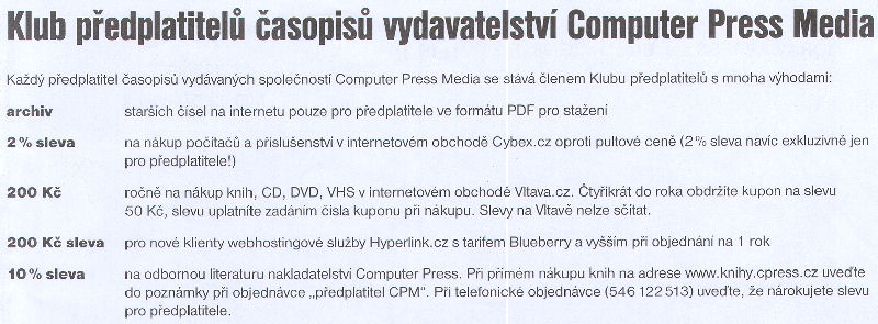 Ale pak jsem dostal ránu mezi oči. CPM neumírá, CPM roste! Důkazem budiž zahájení spolupráce s mediálním gigantem - vydavatelstvím Computer Press. V nedávné době byli zákazníci tohoto vydavatelství seznámeni s nabídkou slev a největšího zvýhodnění se dočkali právě členové-předplatitelé CPM. Tož tedy všem členům gratuluji a trhám si vlasy, že jsem neuváženě vystoupil...