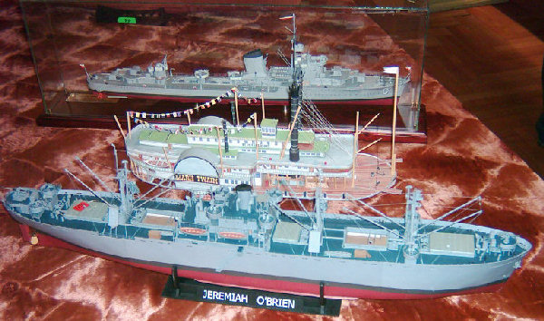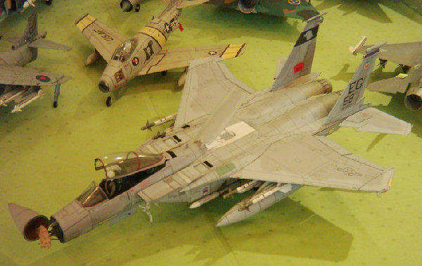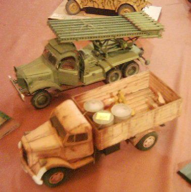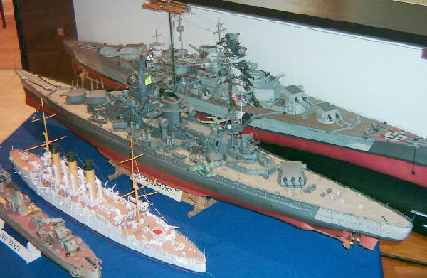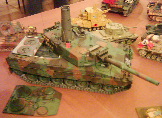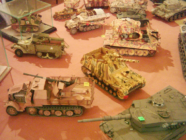 Sále už byl plný modelů. Jeden hezčí než druhý. Nebudu vyjmenovávat všechny kategorie, ani všechny vydavatele, to si zjistěte jinde nebo se mě můžete zeptat meilem. Nejsilněji byla zastoupena letadla pak lodě (včetně plachetnic a ponorek) (Scharnhorst), pak pozemní technika. V drtivé většině to byly modely vojenské techniky od první světové po současnost (Leopard 2A4). Zvláště se mezi nimi vyjímaly tři modely obrovských letadlových lodí v měřítku 1:200. Lexington a Saratoga byly relativně nové a s nimi staršího data vydání současná USS Saratoga. Ta měla úctyhodný metr padesát a paluba vypadala jako solidní žehlící prkno. (Nechyběla ani kolejová technika, k vidění byla i tato nesourodá (pokud jde o vydavatele) směs.)