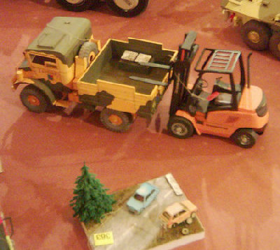 Na sólo stole byla přehlídka modelů neúčastnících se v soutěži. Byly mezi nimi jak prototypové modely různých výrobců, tak i upoutávky na díly řezané laserem od a pro modely fy GPM. Za všechny mohu uvést model přístavního jeřábu 42t. který je kompletně vyřezán laserem. Tomu odpovídá i jeho cena. Další novinkou po papírovém laserovaném zábradlí na lodě, se objevily laserové záchranné pontony. A to hned ve dvou provedeních, britském a americkém. Nabízí opět GPM za sedm zlotých deset kusů. Z firem se na výstavě prezentovaly GPM, Hobby Model s pár novými modely letadel a vrtulníku. To byla aktivnější prezentace. Pasivní prezentace spočívala ve vystavení prototypových modelů SdKfz, Famo od fy Angraf a Kraz 255B od nové firmy Renova Model. Znova ze potvrdilo pravidlo pana Gabriela, že pokaždé když se objeví v Polsku (jednou – dvakrát do roka), najde tam nového vydavatele. Co mne upoutalo svou originalitou, byl nevelký (asi třinácticentimetrový) robotický nakladač, kterým Riplay ve druhém dílu vetřelců hrdinně vystrčila vetřelčí královnu z lodi. A proslýchá se, že by mohl být vydán, ale nic jsem neřekl.