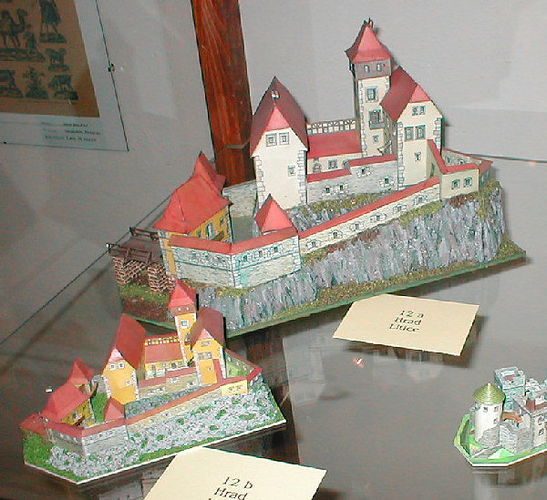 Ve vaši sbírce by ale rozhodně neměla chybět i další verze tohoto modelu - model na pohlednici. Model v měřítku cca 1:1000 nezpracovává stejný rozsah jako model velký, zadní partii hradu pojednává formou diorámatu.