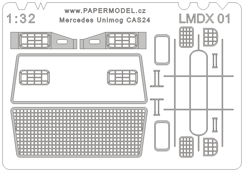 Model hasičského speciálu Mercedes Benz Unimog U5000 CAS 24 si můžete vylepšit pomocí sady LMDX01 obsahující krycí mříž na čelní sklo, reflektory i s blinkry i pro maják.