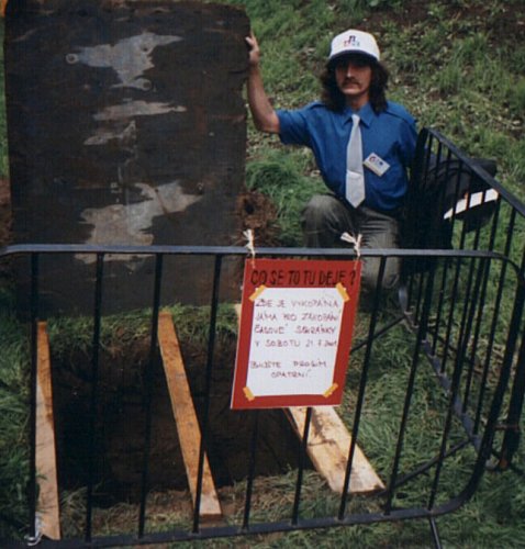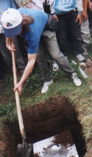 Zahazování hlínou zahájil autor nápadu a poté bylo nářadí předáváno dalším a dalším zájemcům. Takové zapálení lidí s lopatou se jen tak nevidí. Kdyby se to dozvěděl Metrostav, který jen kousek odtud kutá pokračování trasy C metra do Kobylis a na Prosek, určitě by řadu ze zúčastěných lanařil J . Protože pracovníci zoo počítali s větší schránkou, větší část vyházené hlíny odvezli a bylo proto nutno vyslat výpravu pro další materiál, který byl záhy dodán. Zhruba v 15 hodin byl pak navrch usazen kámen s pamětní cedulí informující o uložení časové schránky ABC.