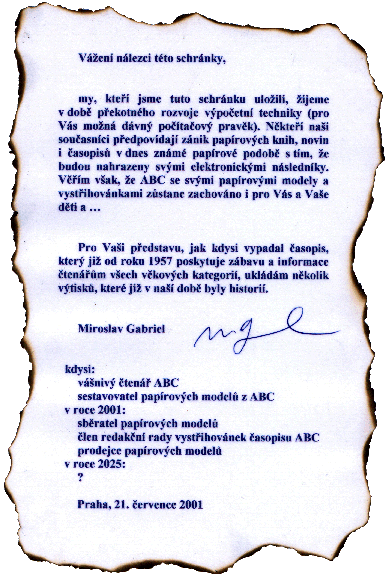 Čtenáři ABC měli již od ledna 2001 možnost zasílat do redakce své vzkazy pro přiští generaci. Kdo to nestihl, měl samozřejmě možnost učinit tak ještě v sobotu přímo na místě. Vzkazy i další vklady, které to umožňovaly, byly zataveny do folie a postupně vkládány do schránky. Jedním z těch, kterým se do "igelitu" (a ani do otvoru) nechtělo byl i sestavený model vysílače na Ještědu. Model autora L. Badalce sestavil špičkový modelář M. Kavalier - oba pánové se akce samozřejmě osobně zúčastnili.