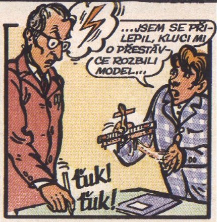 A bylo to! Jak jednoduché. Kdo by pátrajíce po Drábkovi hledal Drábka, že? V registrech mých i v registrech Interpolu leží nekonečné řady podezřelých Burešů a Nováků, Kovářů i Kovaříků, Zelených i Červeňáčků. Ale Drábka nehledal nikdo. Nezbylo než odhalit i Hadžiho, který v občanském životě žije pod jménem Petr Balda. Stejně jako Drábek i on má výtečný cit pro modely. Když jsem ovšem chtěl dovést své pátrání do finále, nasadil Velký Strážce vážný výraz řka: