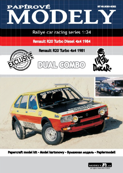 Renault R20 Turbo Diesel 4x4 Dakar 1984 #254 Jean-Claude Cadi, bruno Williamson Renault R20 Turbo 4x4 Dakar 1981 #174 Claude and Bernard Warreau Ze sešitu lze sestavit oba dva kompletní modely. M 1:24 rozsah: 4 × formát A4 autor: Rado Radevicz vydavatel: Modely F1